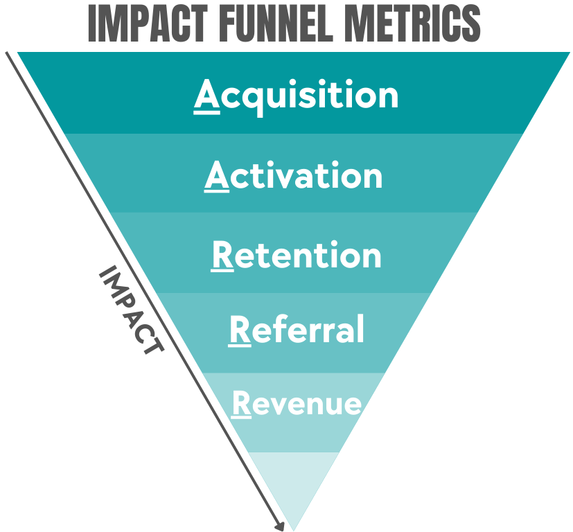 The simplest impact metric we can use is revenue. However, it can often be too isolated to derive what is driving revenue. Before achieving revenue, we can map previous steps to this final impact: How many users are we acquiring? How many users are really using our product? How many users are coming back again? How many users are referring and promoting our product? How many users are paying for it? These metrics can be represented as a funnel.
